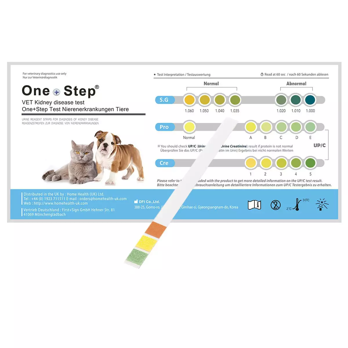 Kidney Check for Cats & Dogs on yksivaiheinen virtsatestiliuska, joka auttaa havaitsemaan koirien ja kissojen munuaissairauden varhaiset merkit nopeasti ja luotettavasti. Testi mittaa kolme keskeistä munuaisten toimintaa kuvaavaa parametriä – ominaispainon, proteiinin ja kreatiniinin – joiden avulla voidaan arvioida virtsan väkevyyttä, proteiinieritystä sekä laskea tärkeä proteiinikreatiniini-suhde (UP/C).